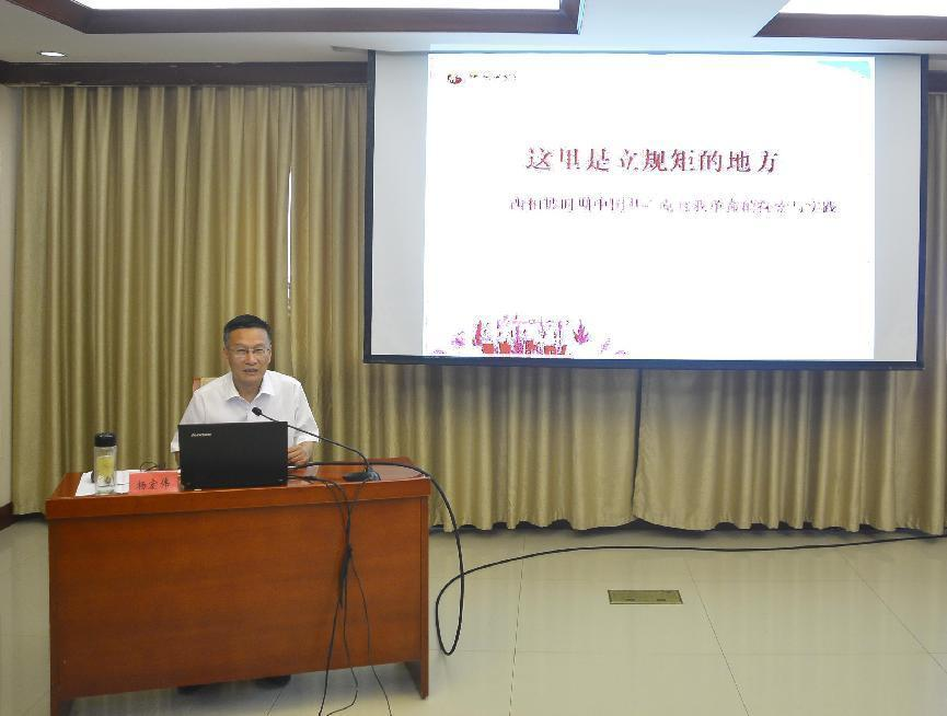 开班仪式结束后,西柏坡纪念馆纪委书记杨宏伟以“这里是立规矩的地方——西柏坡时期中国共产党自我革命的探索与实践”为题,结合习近平总书记在西柏坡的多次重要讲话精神和大量生动的历史案例,阐释了党如何在复杂多变的革命环境中坚持自我净化、自我完善、自我革新、自我提高。他强调,西柏坡时期的自我革命实践不仅是对当时革命形势的积极应对,更是对党自身建设规律的深刻把握和运用。西柏坡时期党在自我革命道路上的探索与实践,为新时代全面从严治党提供了宝贵的历史借鉴。讲座内容丰富、观点鲜明、深入浅出,大家纷纷表示,通过聆听讲座深刻感受到了西柏坡精神的光辉照耀,更加坚定了在新时代推进全面从严治党的信心和决心。