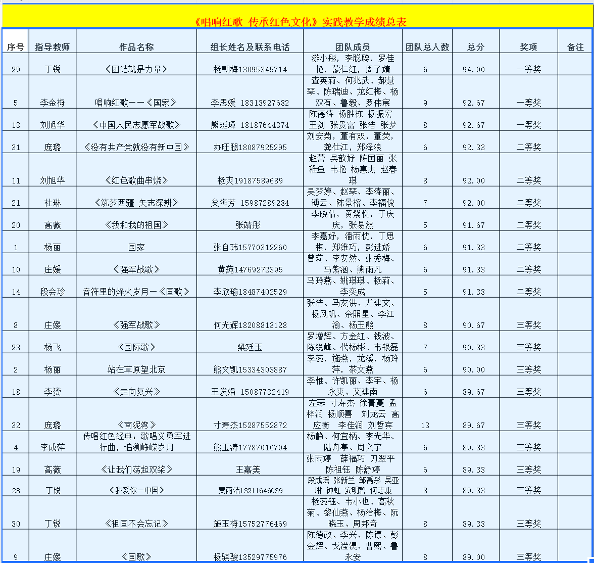 附件:“毛泽东思想和中国特色社会主义理论体系概论”课程“唱响红歌 传承红色文化”主题的践教学成绩汇总表