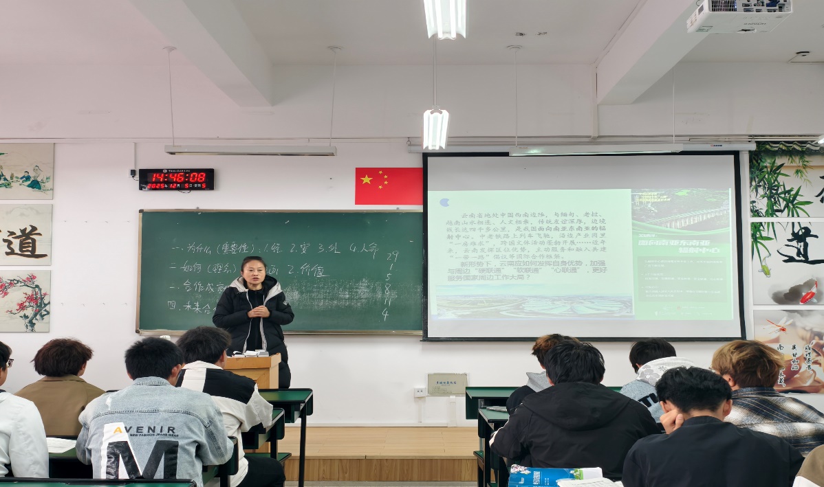 副董事长张云霞以“携手周边国家,共创美好未来”为题,立足近期国际外交动态,深入剖析了我国周边地缘格局,阐释了中国外交的总体方向与重点战略,解读了我国的周边外交具体举措。并结合云南作为西南边疆省份、与多国接壤的独特地理优势,分析了云南在服务国家周边外交战略中的定位与潜力,为课堂教学提供了鲜活的本土案例和实践素材。