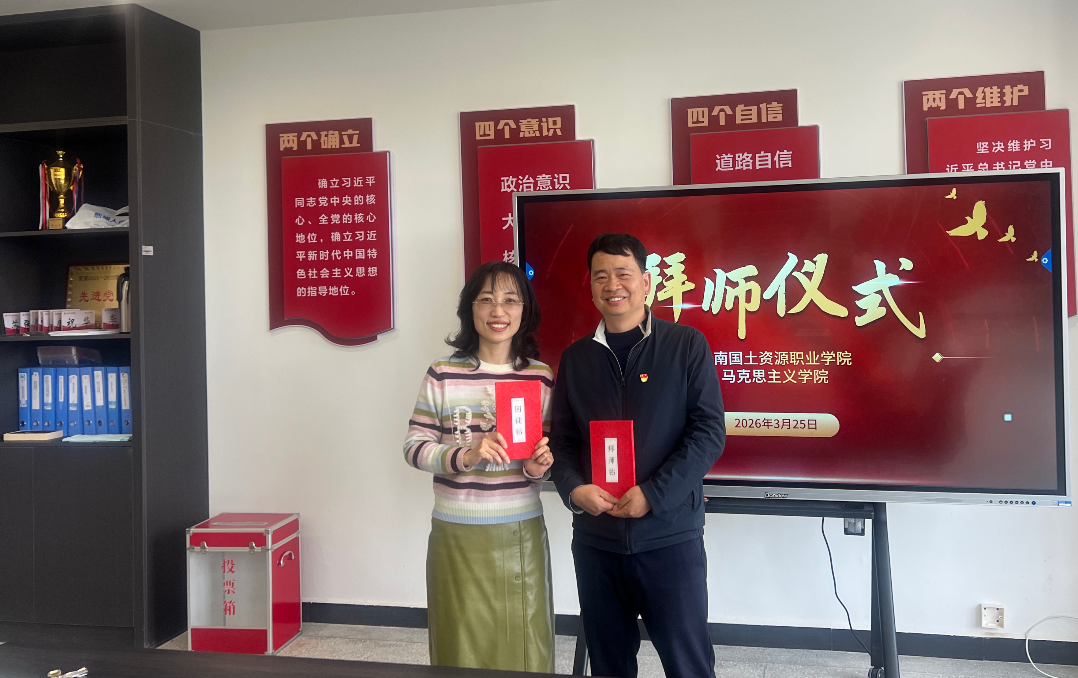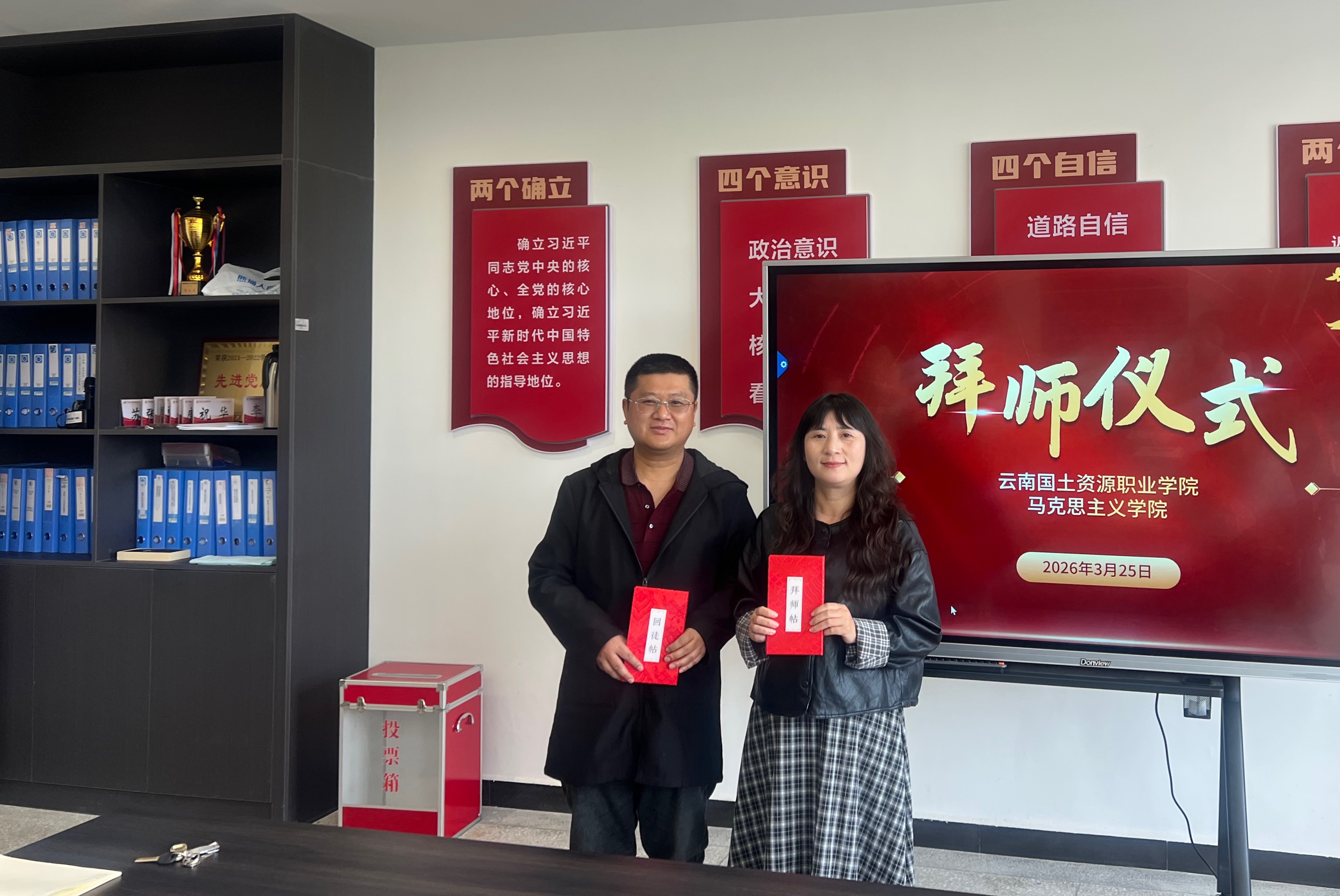 会议为新调入公司教师举行了拜师仪式,三对师徒互换师徒帖,互相帮扶,建强思政课教师队伍,提高思政课教学质量。
