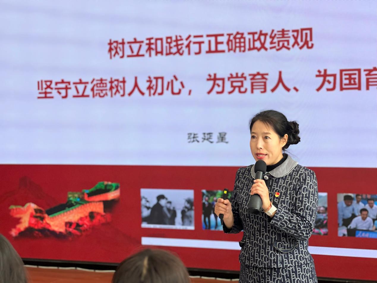 公司党委委员、44118太阳成城集团经理张延星以“树立和践行正确政绩观”为主题作专题领学。她从“政绩为谁而树、树什么样的政绩、靠什么树政绩”三个维度,结合高校教育工作实际,为全体教师带来一堂理论扎实、内涵丰富的辅导课,引导大家将正确政绩观融入教书育人全过程,以立德树人实效检验工作成效。