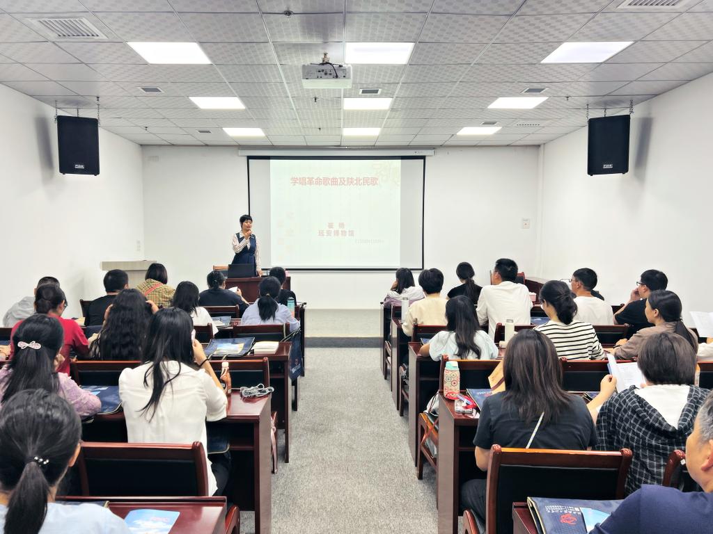 8月28日晚,延安博物馆副研究员崔艳以歌叙史、以史述歌,通过齐唱红色革命歌曲,学唱陕北民歌,介绍陕北民俗特色,教扭陕北大秧歌方式,变“理论灌输”为“音乐感染”,变“普通教育”为“精神大餐”,变“经典感动”为“新颖互动”,使学员们了解到陕北民歌的丰富种类与深厚底蕴,更体会到陕北人民对共产党和毛泽东等领袖的热爱,将延安精神深深烙在心中。